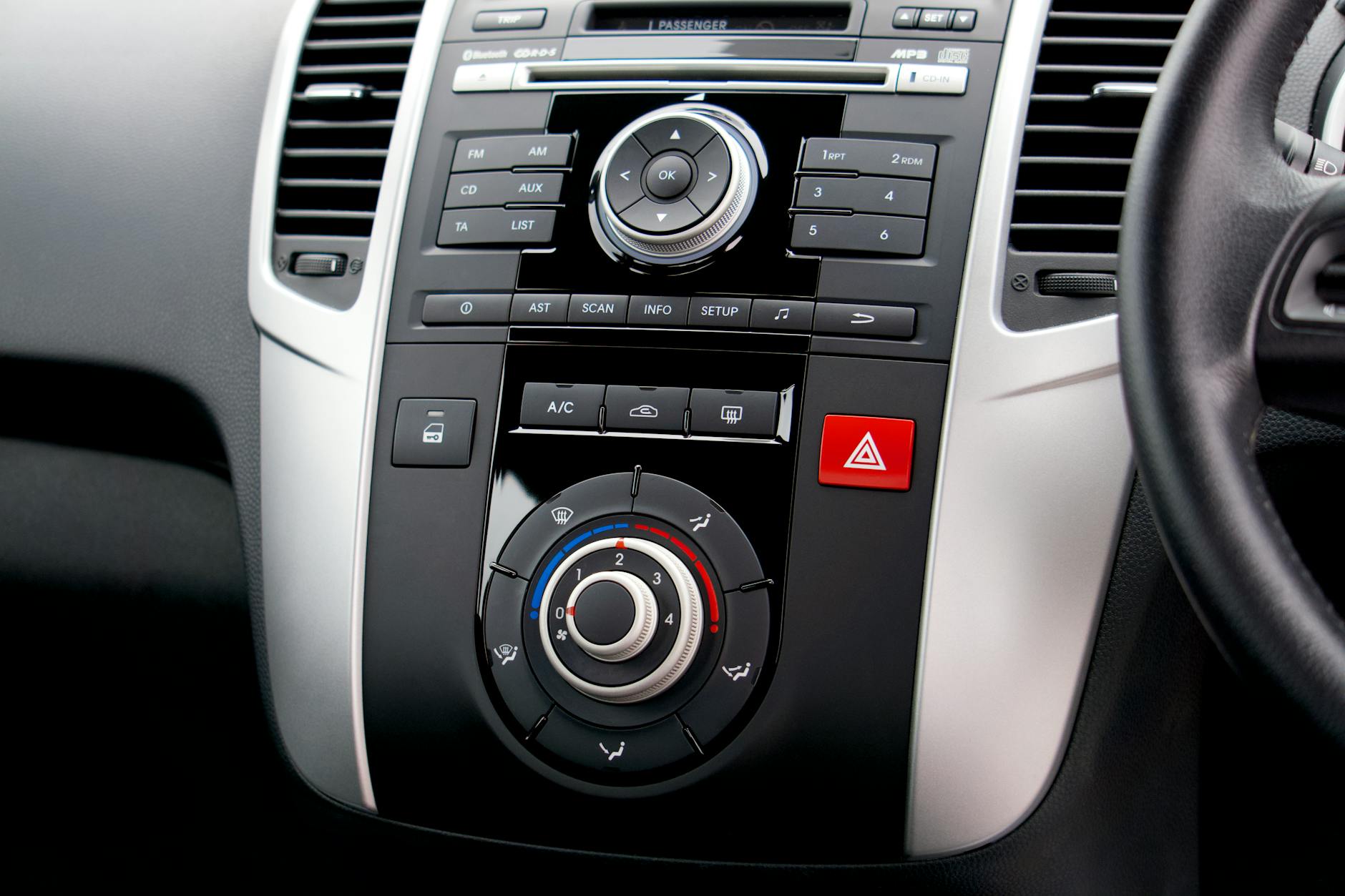 Deska rozdzielcza Peugeota z kierownicą i przyciskami systemów wspomagania